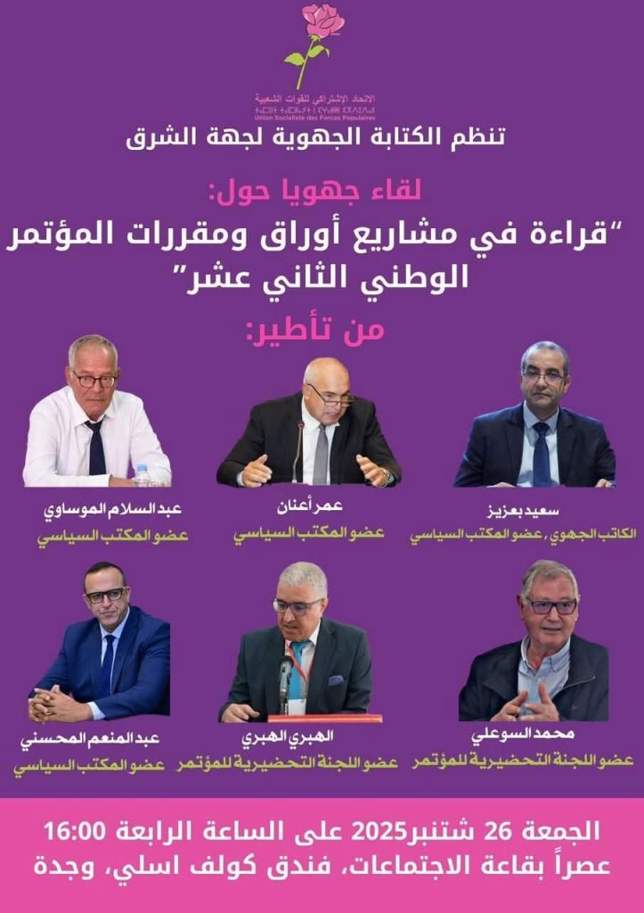 تنظم الكتابة الجهوية لحزب الاتحاد الاشتراكي للقوات الشعبية بجهة الشرق، يوم الجمعة 26 شتنبر 2025، لقاءً جهوياً تحت عنوان: “قراءة في مشاريع أوراق ومقررات المؤتمر الوطني الثاني عشر”، وذلك ابتداءً من الساعة الرابعة عصراً بقاعة الاجتماعات بفندق كولف اسلي بمدينة وجدة.